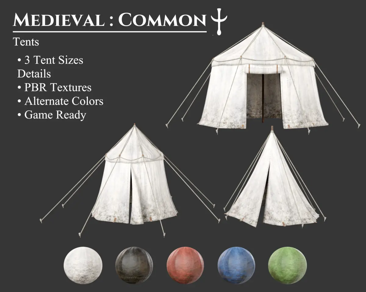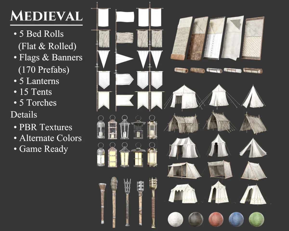 - This Collection Set offers 7 separate products, 41 individual models, in 5 aesthetic styles, totalling 205 models, all perfect for building a medieval campsite. Included are tents, bedrolls, torches, lanterns, flags, and banners. These models may be included in other collections for a different price.