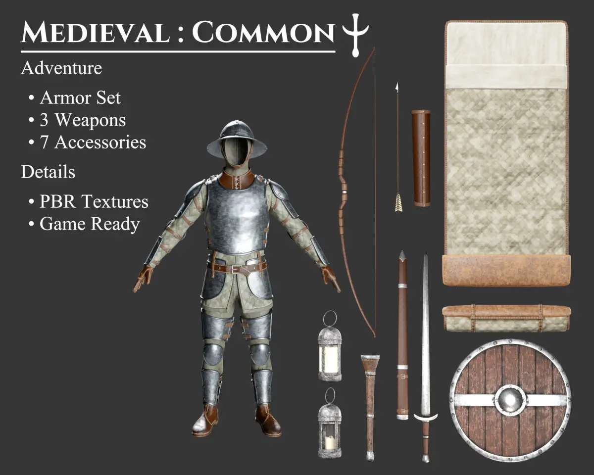 - This Collection Set offers 7 separate products, with a total of 11 individual models. This package features medieval armor, weapons and accessories in the same Common aesthetic style. These models may be sold in other collections for a different price.
