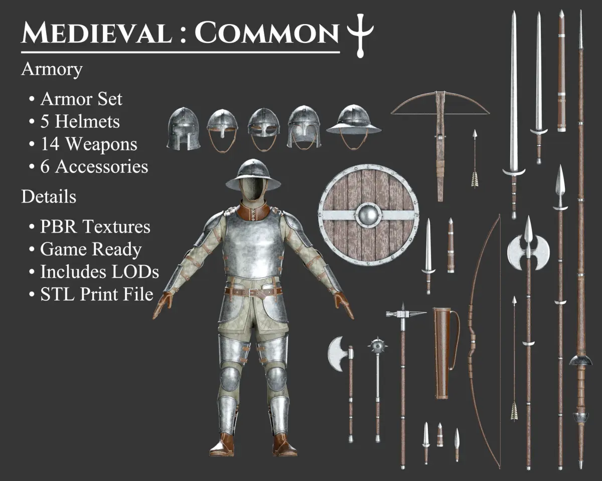 - Includes 26 models in the same cohesive Common style which is designed to look like the weapons and armor of an average soldier fighting on a medieval battlefield. The aesthetic is a simple mixing of cloth, leather, wood, and metal with light dirt and scratches. These models can be purchased separately. These models may be included in other collections for a different price.