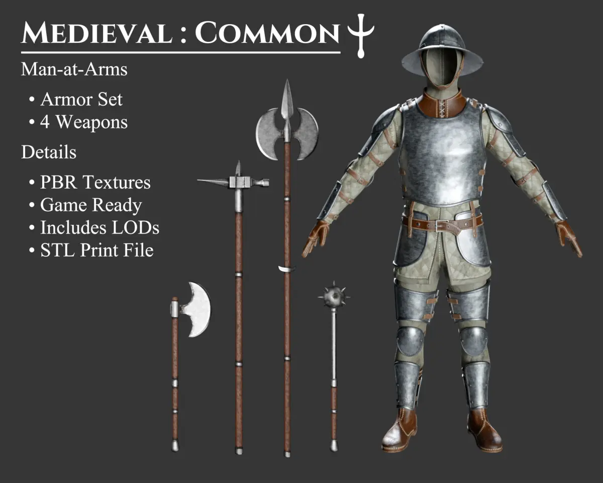 - This Collection Set offers an Armor Set and 4 matching Weapons and all in the Common style. Each model includes 3 Polygon levels; High Poly, Medium Poly, and Low Poly. These models can be purchased separately. These models may be included in other collections for a different price.