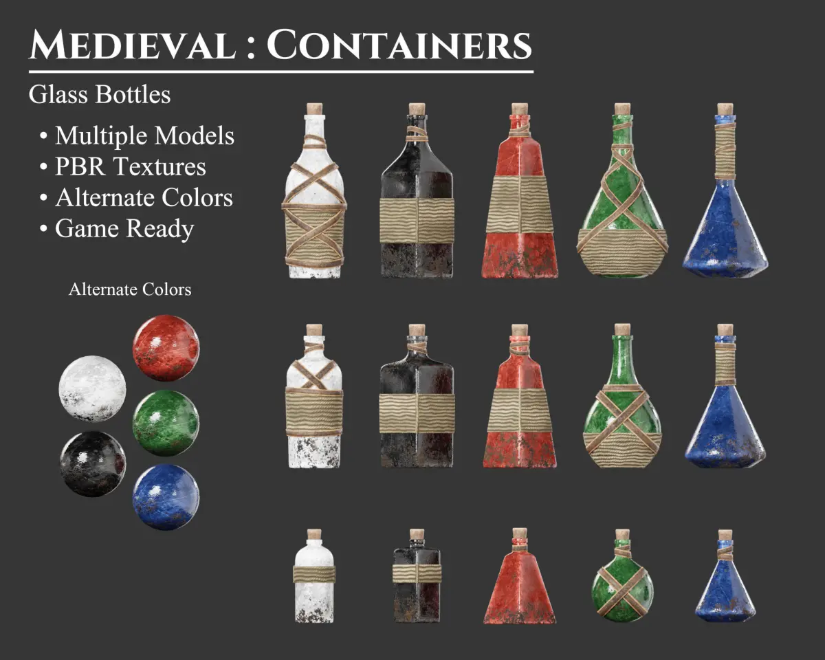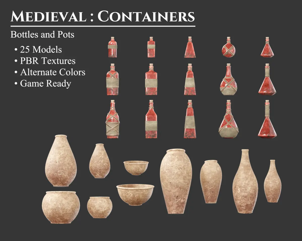 - 25 Models are included in this variety pack of bottles and jars. These models can be used in different settings including Medieval, fantasy, frontier, western, etc. They can be used as background props in a tavern, or as storage on a wagon.