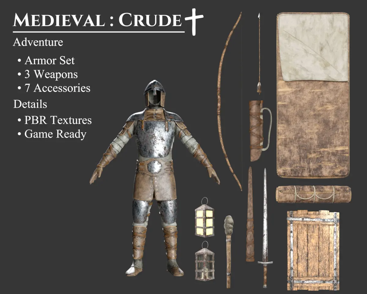 - This Collection Set offers 7 separate products, with a total of 11 individual models. This package features medieval armor, weapons and accessories in the same Crude aesthetic style. These models may be sold in other collections for a different price.