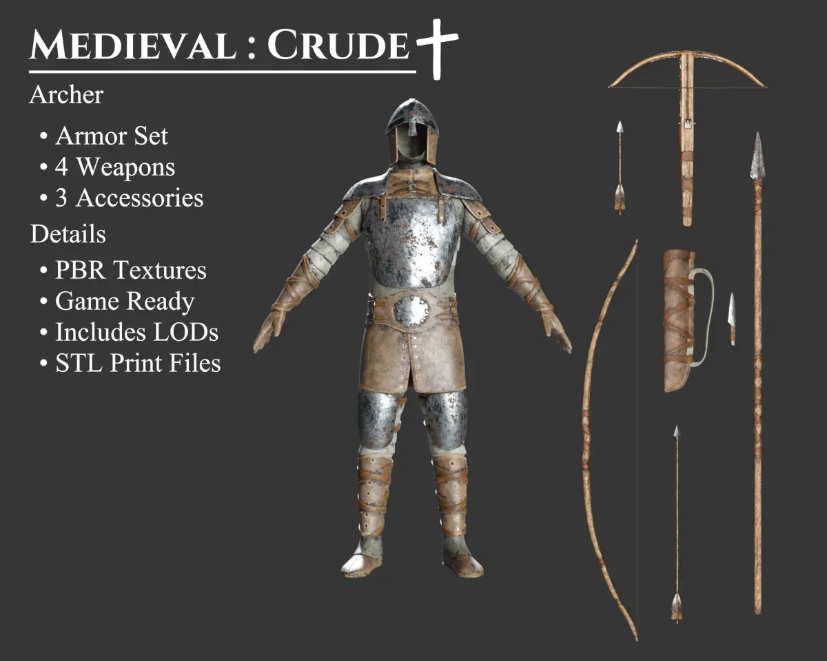 - This Collection Set offers an Armor Set and 7 matching Weapons and Accessories all in the Crude style. Each model includes 3 Polygon levels; High Poly, Medium Poly, and Low Poly. These models can be purchased separately. These models may be included in other collections for a different price.