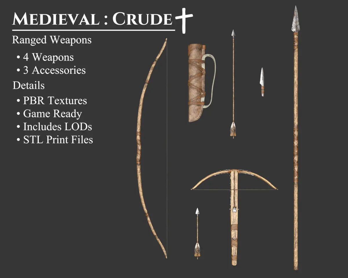 - This Collection Set offers 7 unique weapons and accessories all in the same aesthetic Crude style. Each model includes 3 Polygon levels; High Poly, Medium Poly, and Low Poly. These models can be purchased separately. These models may be included in other collections for a different price.