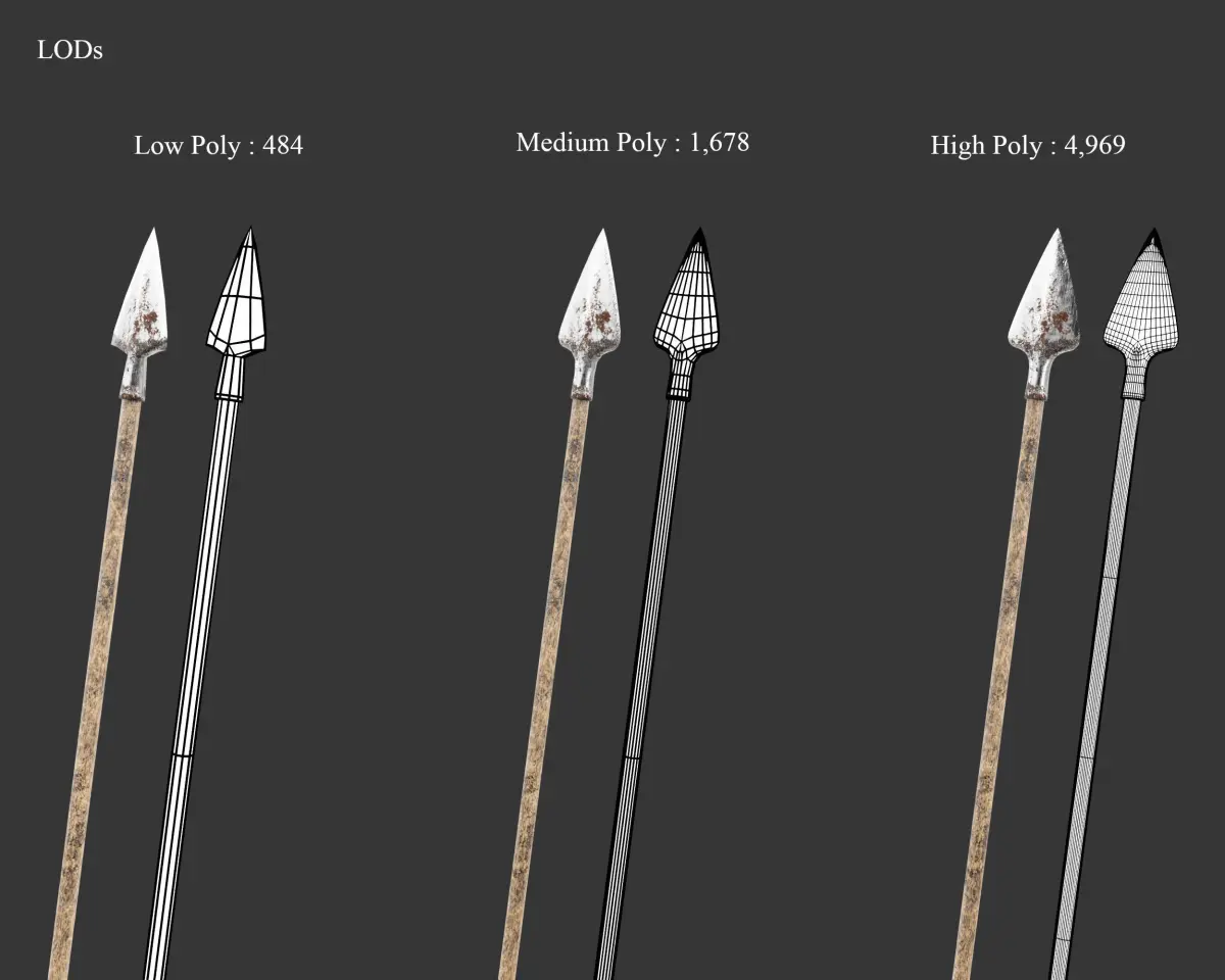 - Each Model has Low Poly, Medium Poly, and High Poly models.