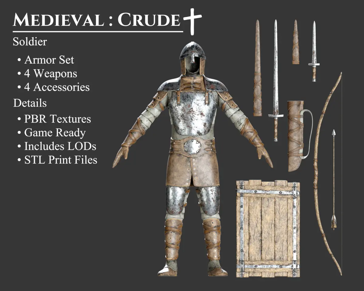 - This Collection Set offers an Armor Set and 8 matching Weapons and Accessories all in the Crude style. Each model includes 3 Polygon levels; High Poly, Medium Poly, and Low Poly. These models can be purchased separately. These models may be included in other collections for a different price.