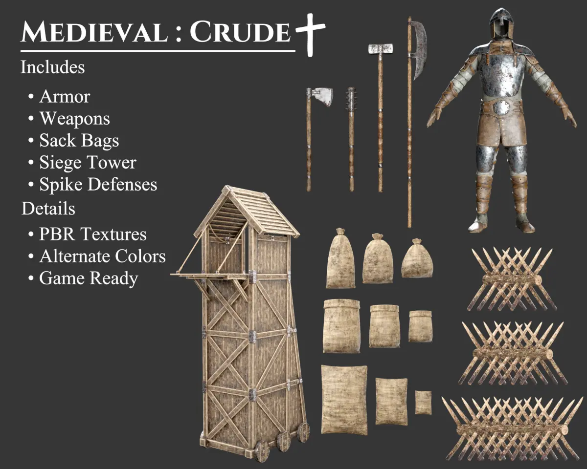 - This Collection Set offers 8 separate products, with a total of 18 individual models. This package features medieval armor and weapons in the same Crude aesthetic style. These models may be sold in other collections for a different price.
