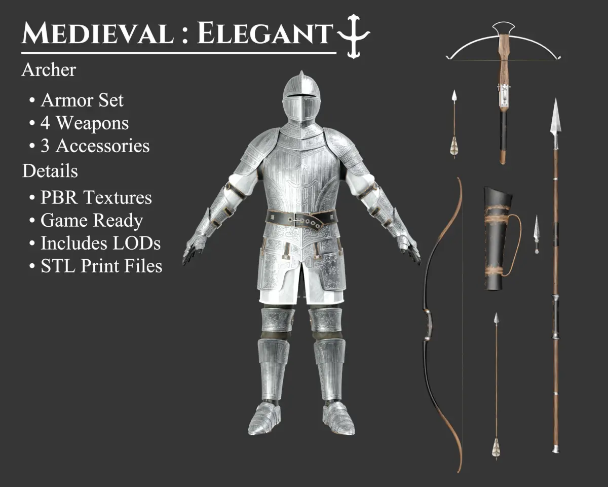 - This Collection Set offers an Armor Set and 7 matching Weapons and Accessories all in the Elegant style. Each model includes 3 Polygon levels; High Poly, Medium Poly, and Low Poly. These models can be purchased separately. These models may be included in other collections for a different price.