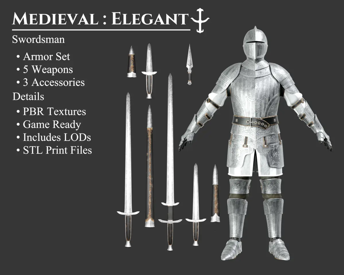 - This Collection Set offers an Armor Set and 8 matching Weapons and Accessories all in the Elegant style. Each model includes 3 Polygon levels; High Poly, Medium Poly, and Low Poly. These models can be purchased separately. These models may be included in other collections for a different price.
