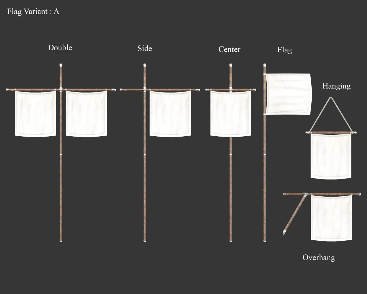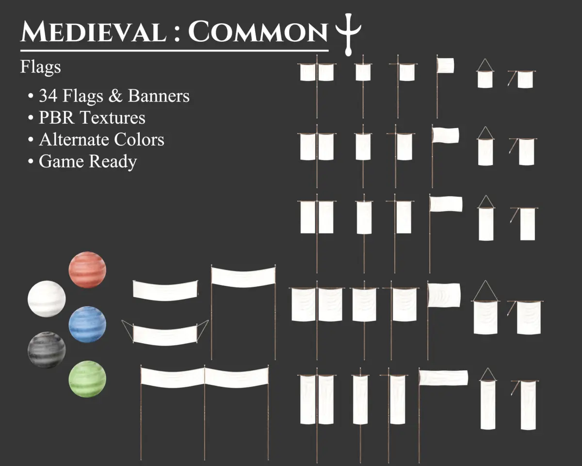- This Collection offers 5 sets of Medieval Flags & Banners. Includes the Crude, Common, Knightly, Elegant, and Noble Styles. Each set of Flags and Banners uses a trim-sheet containing 6 unique flag shapes which have been configured into 34 total objects. Objects sharing the same base flag UVs have been labelled A - F. (170 Total Models) These models can be purchased separately. These models may be included in other collections for a different price.