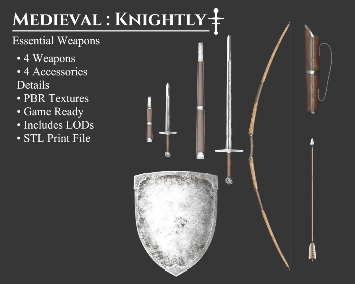 - This Collection Set offers 8 unique weapons and accessories all in the same aesthetic Knightly style. Each model includes 3 Polygon levels; High Poly, Medium Poly, and Low Poly. These models can be purchased separately. These models may be included in other collections for a different price.