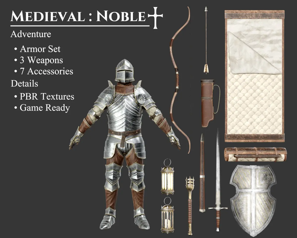 - This Collection Set offers 7 separate products, with a total of 11 individual models. This package features medieval armor, weapons and accessories in the same Noble aesthetic style. These models may be sold in other collections for a different price.