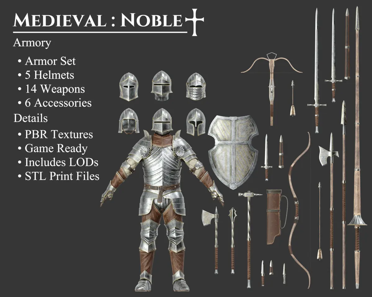 - Armor Set, Helmets(5), Axe, Bow & Arrow (+ Quiver), Crossbow (+ Bolt), Dagger (+ Sheath), Knife (+ Cover), Lance, Long Sword, Mace, Pole Axe, Shield, Short Sword (+ Scabbard), Spear, Throwing Knife, and Warhammer.