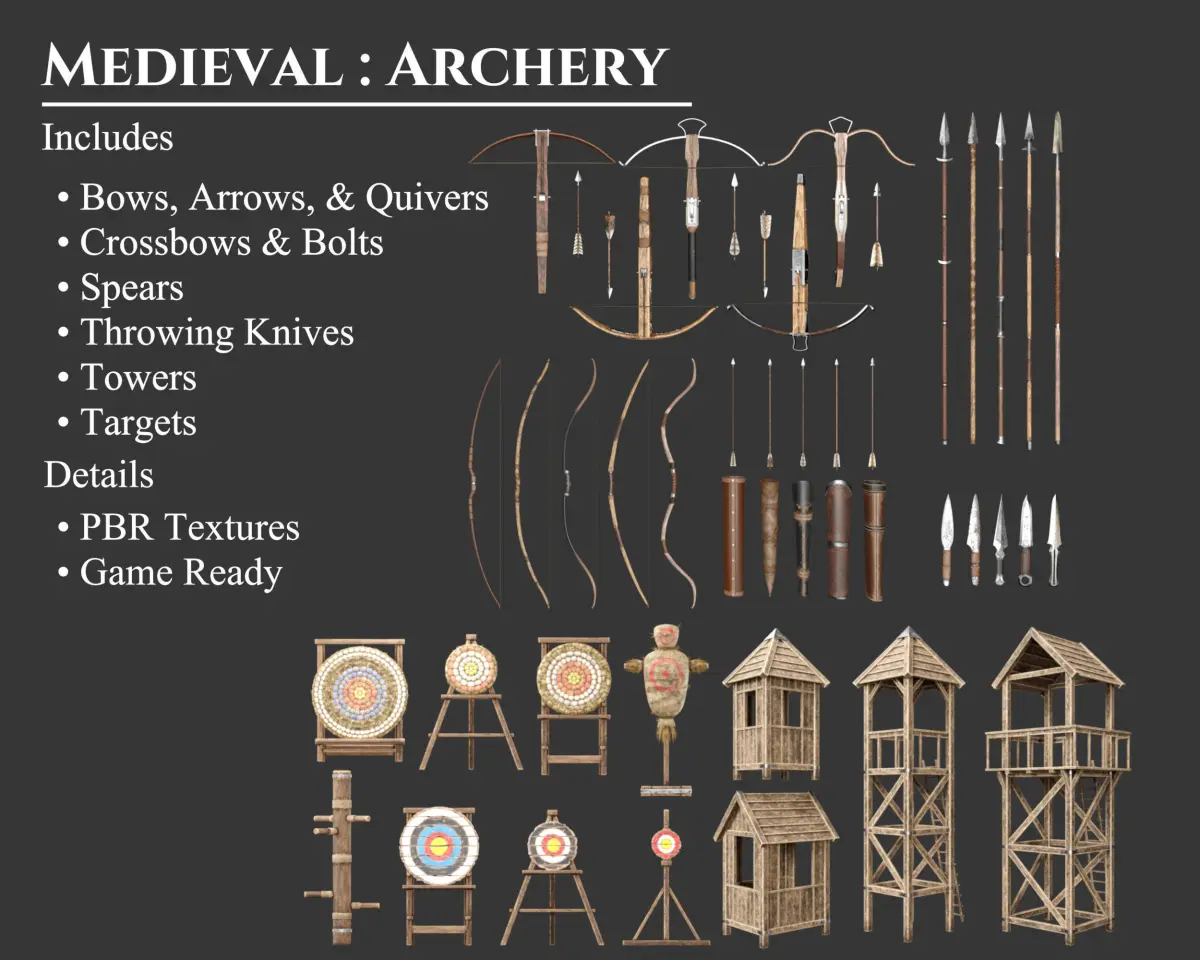 - Bow & Arrow (+ Quiver), Crossbow (+ Bolt), Spear, and Throwing Knife. In 5 aesthetic styles. (Common, Crude, Elegant, Knightly, Noble) Guardpost Large, Guardpost Small, Guardtower Large, Guardtower Small, Hay Targets (+ Stands), Wooden Targets (+ Stands), Hay Training Dummy, and Wooden Training Dummy.
