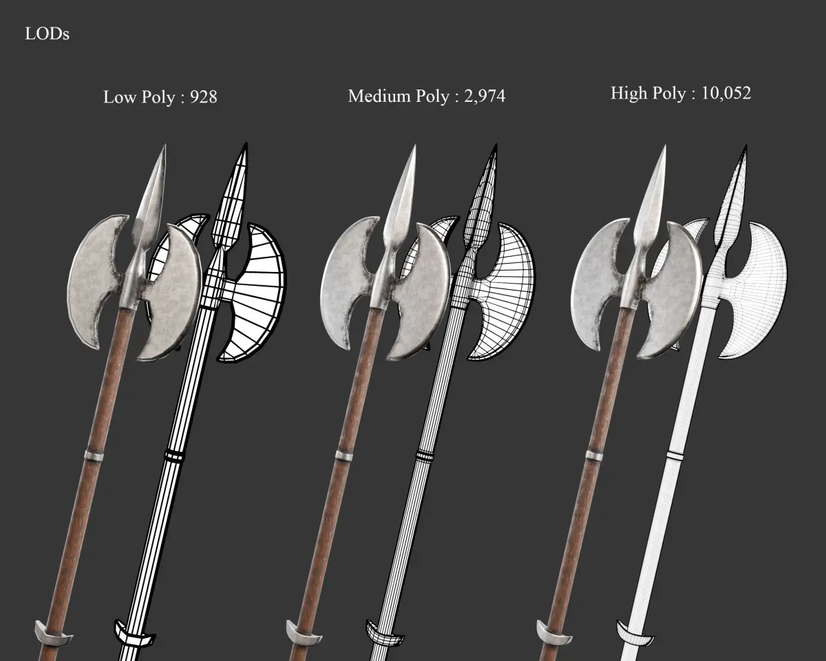 - Includes 3 Poly Levels / LOD variants for each model; Low Poly, Medium Poly, and High Poly.