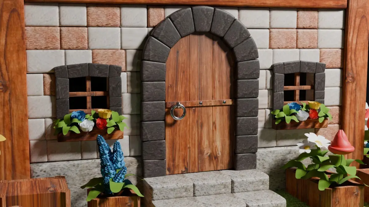 - Wooden Elements: The wooden beams, and door are all textured to show wood grain and knots, enhancing the rustic feel.