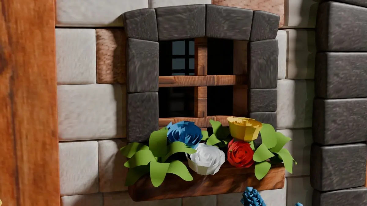 - Walls: The exterior walls are constructed from a mix of stone and brick textures in varying shades of grey and brown, giving the cottage a sturdy yet rustic appearance. Wooden beams frame the corners and edges, adding to the authenticity.
