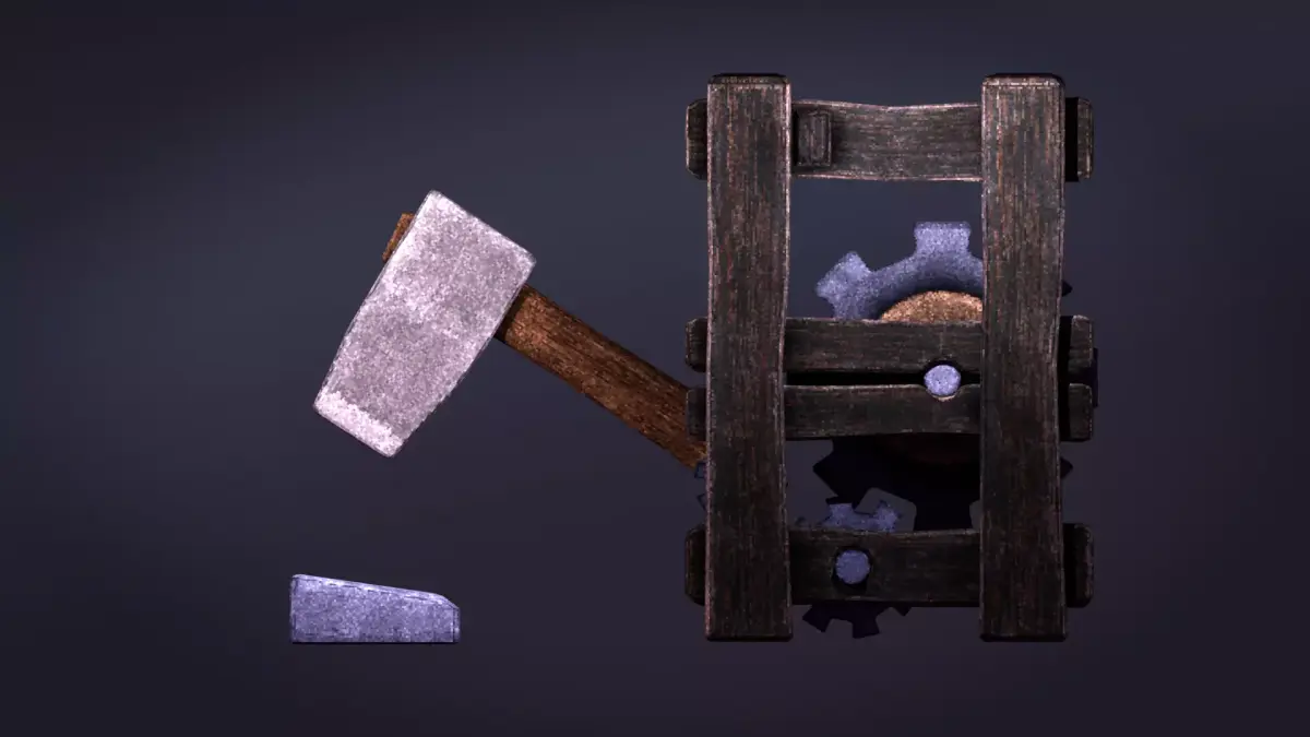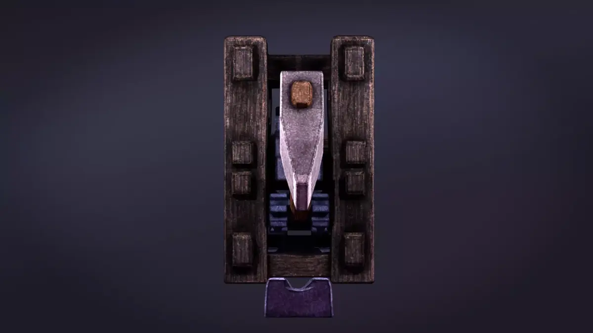A stylized medieval crushing trap designed for dark fantasy and dungeon environments. This prop features a wooden cage mechanism combined with a heavy hammer, ideal for creating interactive or decorative trap systems in your game levels.