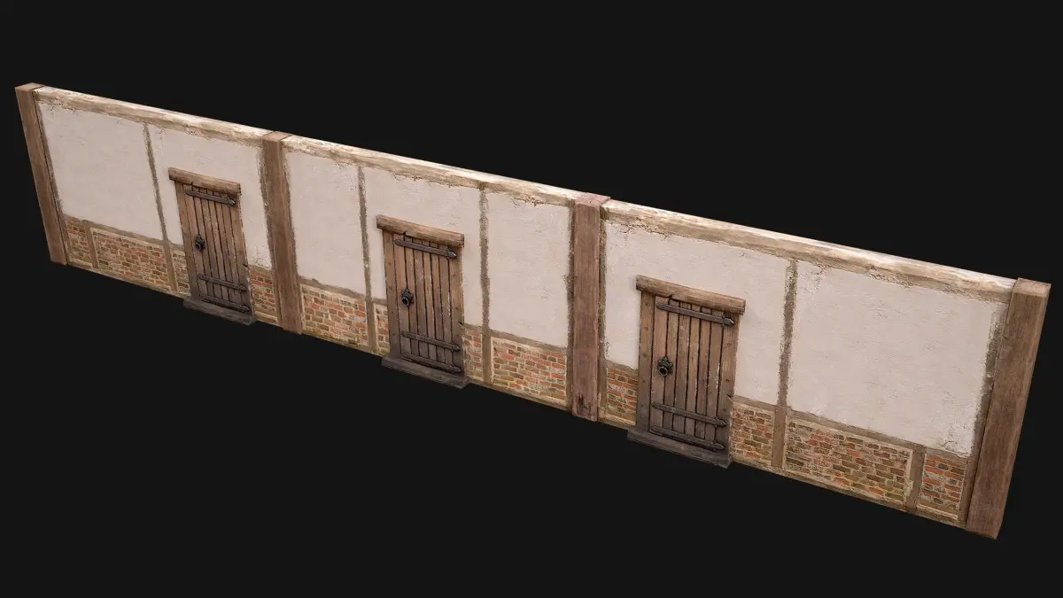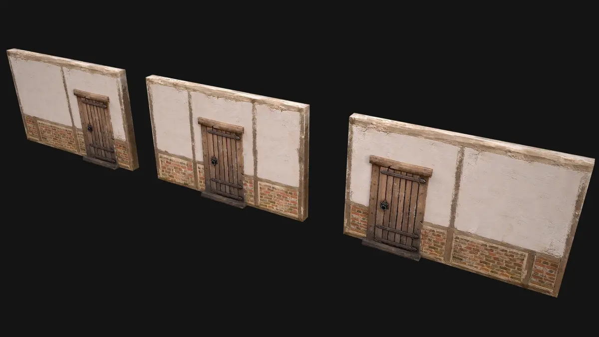 Game ready model Medieval Door and Wall .The model contains lods, detailed information on the images.Stylized and detailed Medieval Door and Wall textured, sculpted and rendered with Physical based rendering (PBR) - Shown images have been rendered in Marmoset Toolbag .The set contains 3 models of walls with a door and 3 models of wooden columns.