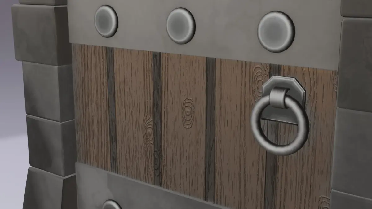 The door features intricate details such as wrought iron hinges, wooden planks, and metal studs. These details are achieved through a combination of modeling and texturing techniques, making the door an excellent example of high-quality 3D asset creation.
