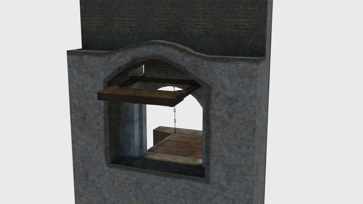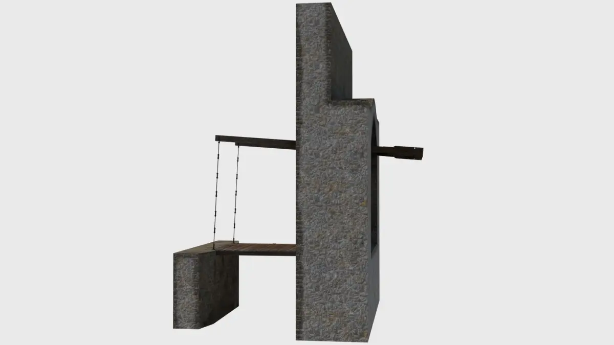 Low-poly historical accurate reconstruction of a drawbridge with lifting arms (gaffs) and counterweights mechanism for castle or town gates. This form was very common from the 14th century onwards. Due to the counterweight, the bridge can be operated by only one person, by pulling or releasing a rope attached to its end. The arms or gaffs fit in slits in the outer wall, when the bridge is lifted.