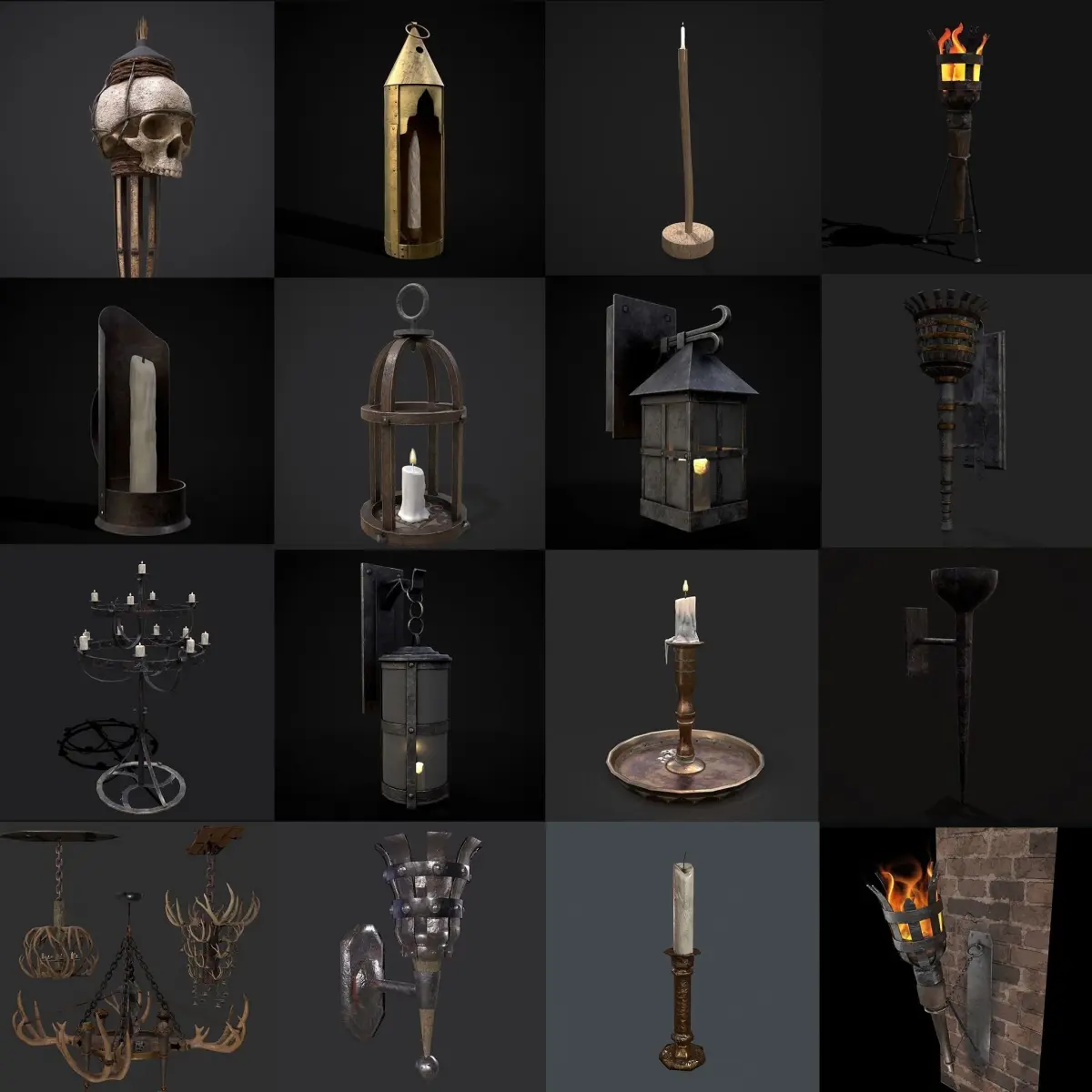 Medieval Eighteen Lights 3D Model - Files Include FBX and OBJ. Includes PBR Texture in 4096 x 4096. - Maps include : Basecolor, Normal, Roughness, Height and Metallic. All Preview renders were done Marmoset Toolbag 4. See each models link in the content section for marmoset viewers and wireframe renders. Scaled to real world scale. Customer Service Guaranteed. From the Creators at Get Dead Entertainment. Please like and Rate! Follow us on FaceBook and Instagram to keep updated on all our newest models.