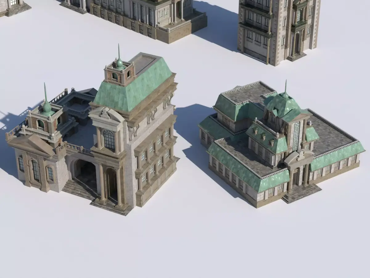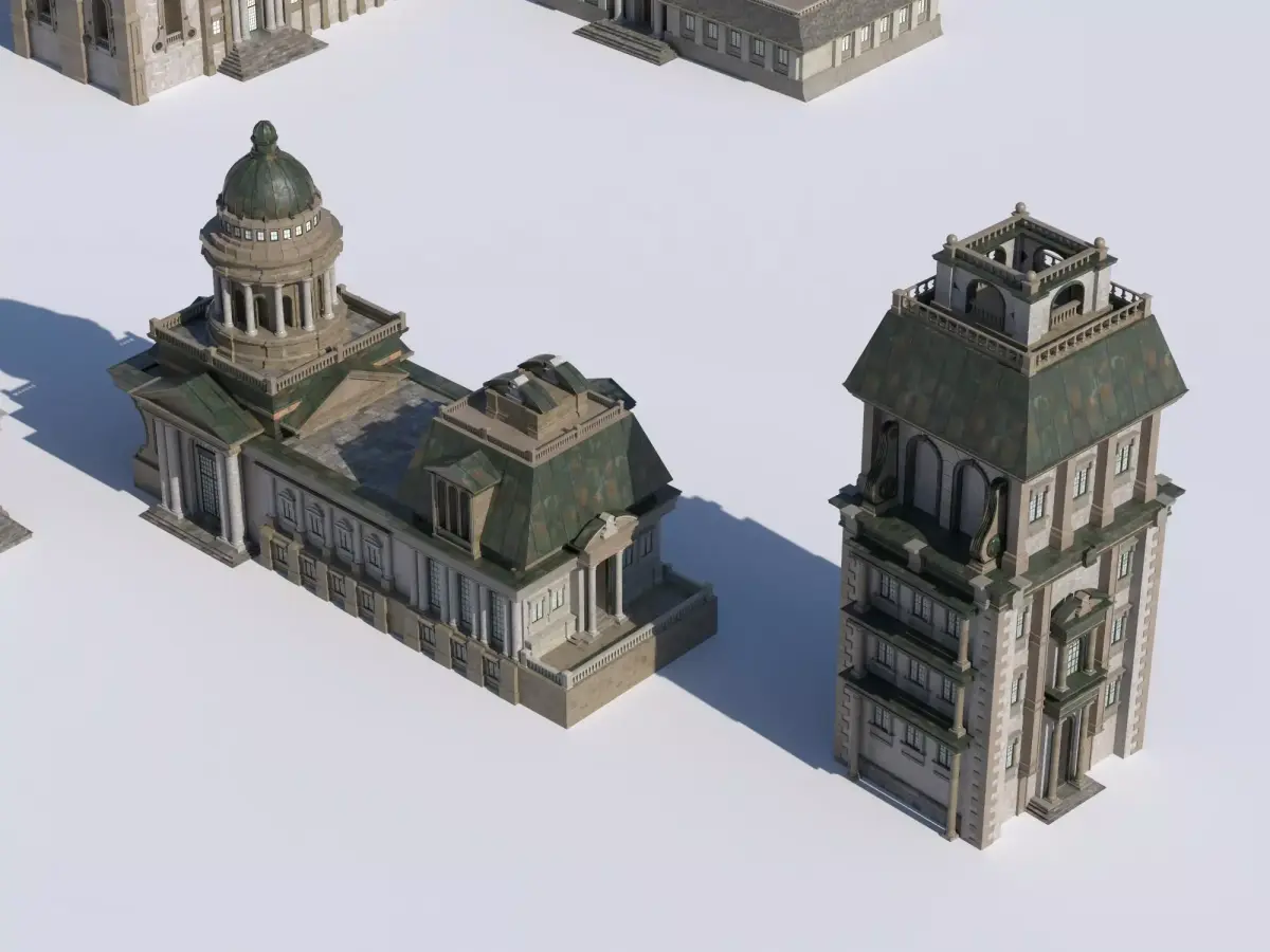 High-quality European classical style public buildings, inspired by historical architecture from the late 18th to early 20th centuries. This asset pack includes multiple unique buildings featuring towers, domes, columns, arches, and exquisite stone facades, perfect for creating realistic historical cities or grand scenes.