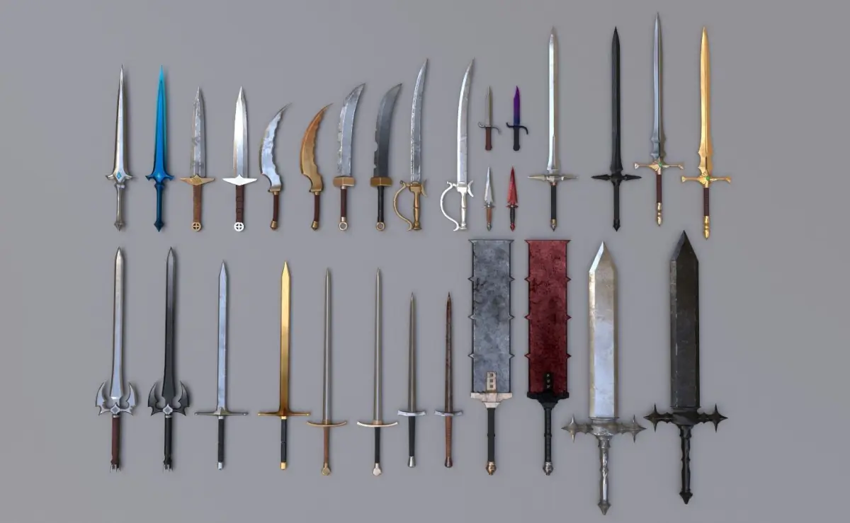 MODELSAll models average around 1,500 tris each, with smaller ones being 700 tris and a couple of larger ones at 3,200 tris.There are no LODs included.Each weapon sits at 0,0,0 origin facing upwards, with the pivot at the origin/lowest point of model.In the included MayaLT scene, I added the standard Unreal Engine 4 mannequin as a sizer so you can see the sword sizes as they will appear in-game if you are using UE4.