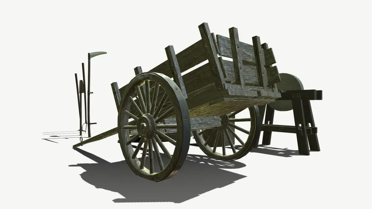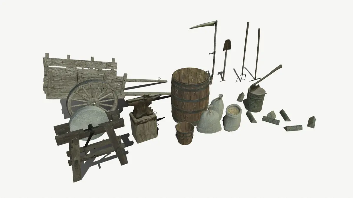 Contains:CartAxescytheforkrakebarrelgrindstoneanvilsackshovelbucketchopping block