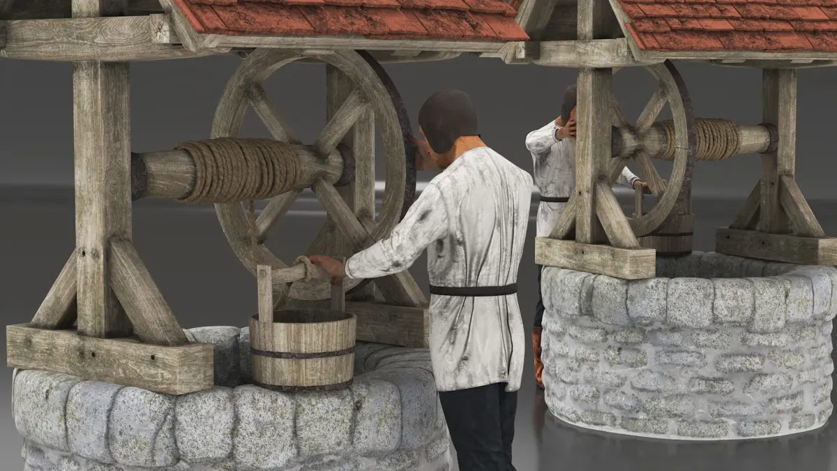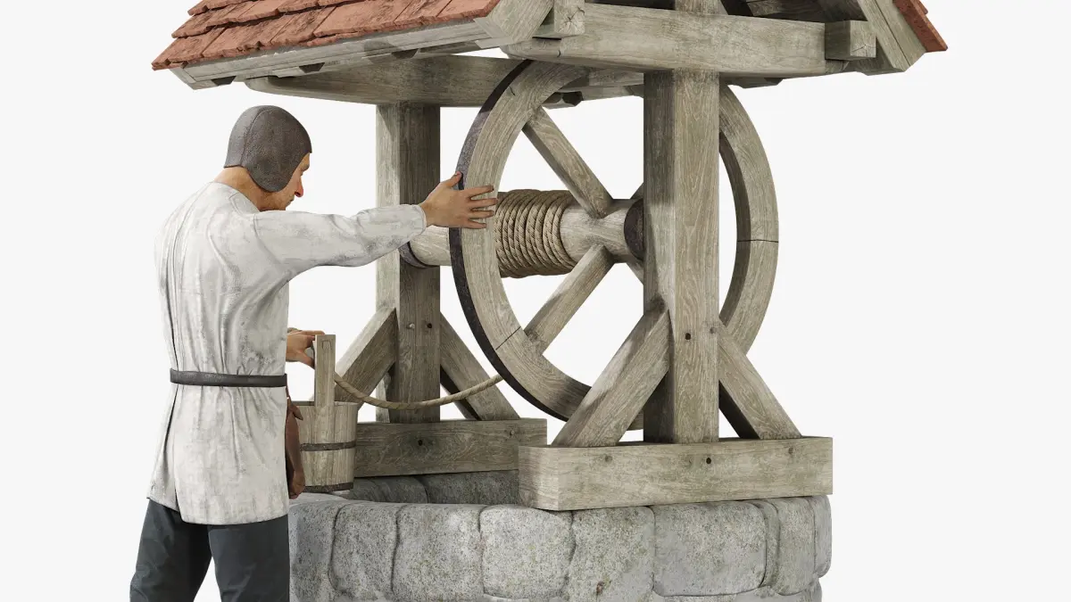 Medieval Farmer by Well is a three-dimensional model of historical agricultural worker, depicting a medieval-era farmer standing near a stone well.