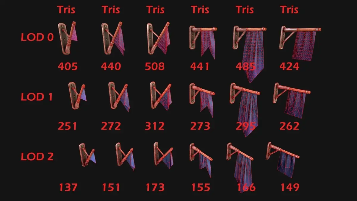 - Tris: 405(LOD0),251(LOD1),137(LOD2).