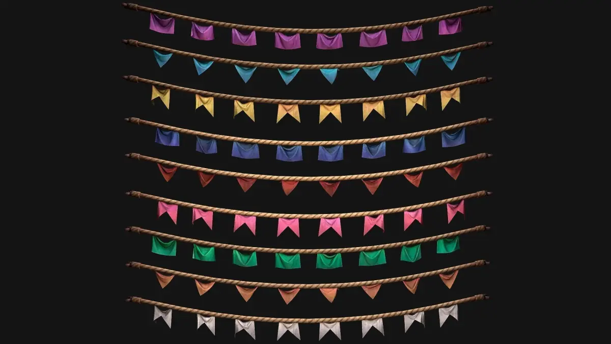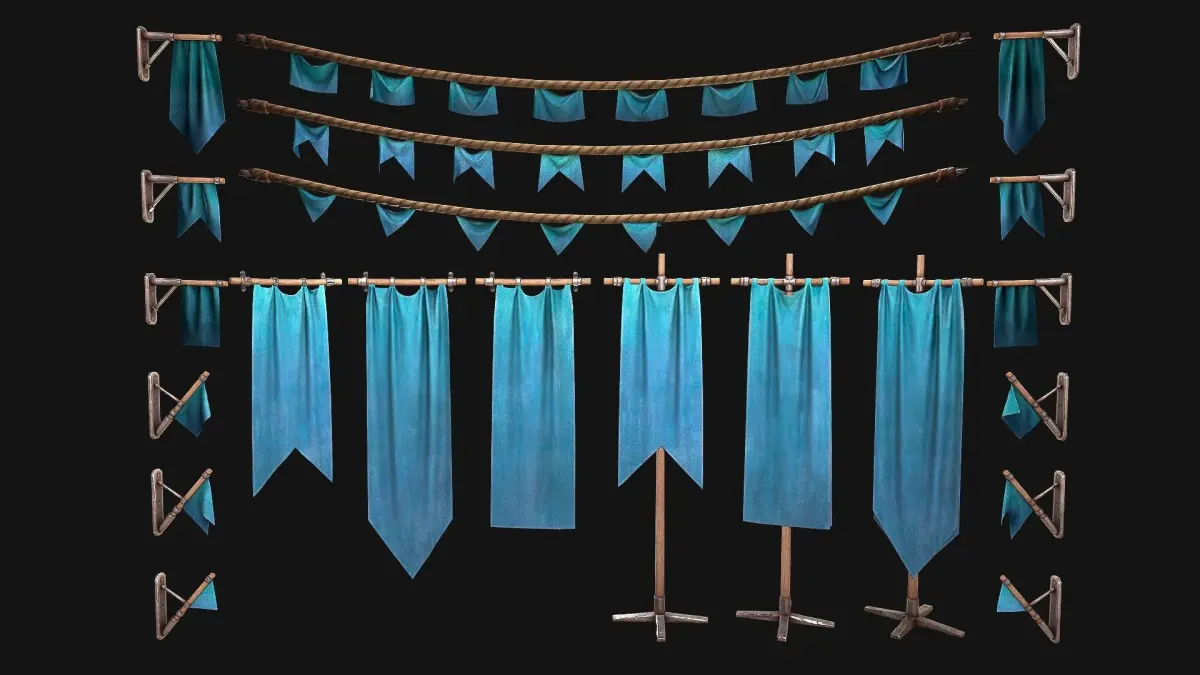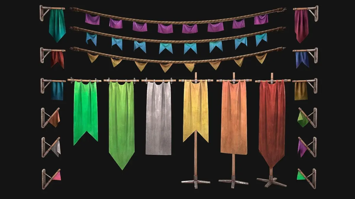 Game ready models .The model contains lods, detailed information on the images.Stylized and detailed Medieval Flags Pack fully textured, sculpted and rendered with Physical based rendering (PBR) - Shown images have been rendered in Marmoset Toolbag .Information about polygons and lods can be seen on the renders.A set containing 15 flag models.