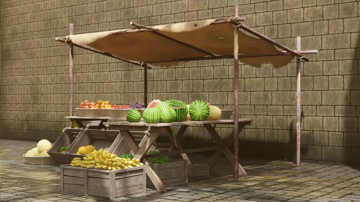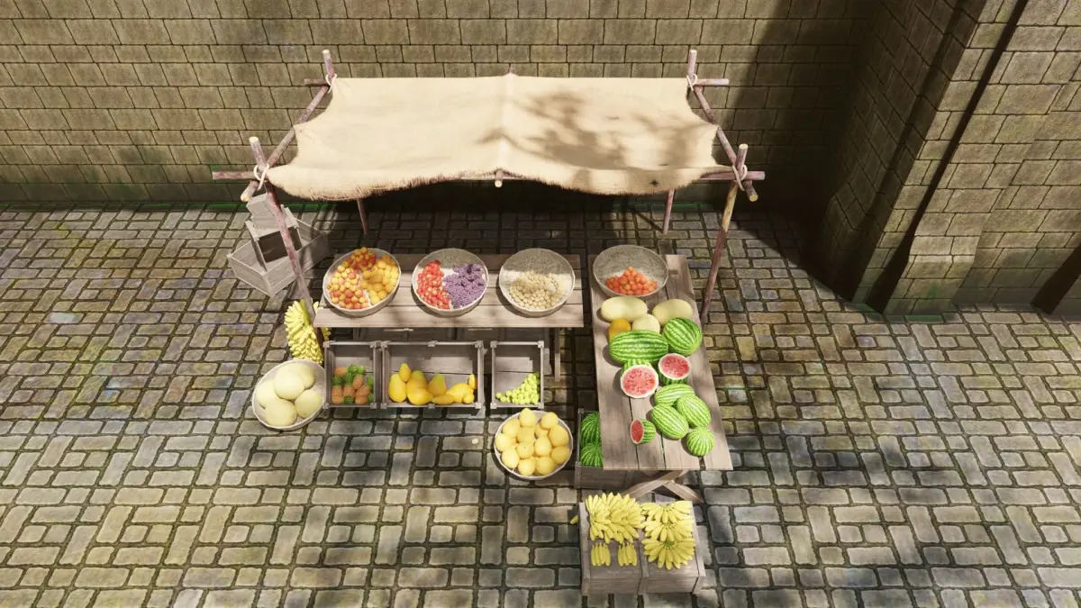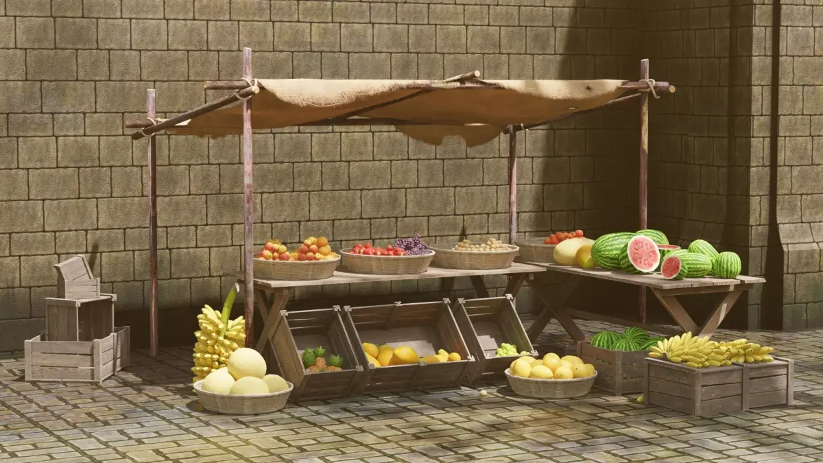 1) Apple : 240 Tris, 2) Pomegranate : 360 Tris, 3) Papaya : 336 Tris, 4) Pine apple : 816 Tris, 5) Kiwi : 264 Tris, 6) Grapes : 1626 Tris 7) Guava : 240 Tris, 8) Watermelon : 312 Tris, 9) Half - Watermelon : 168 Tris, 10) Mango : 400 Tris, 11) Strawberry : 508 Tris, 12) Banana : 392 Tris, 13) Muskmelon : 528 Tris, 14) Orange : 448 Tris, 15) Big Crate : 468 Tris, 16) Small Crate : 320 Tris, 17) Basket : 462 Tris, 18) Tent : 1362 Tris, 19) Table : 260 Tris