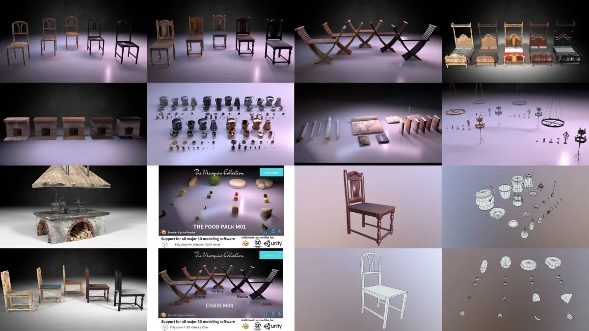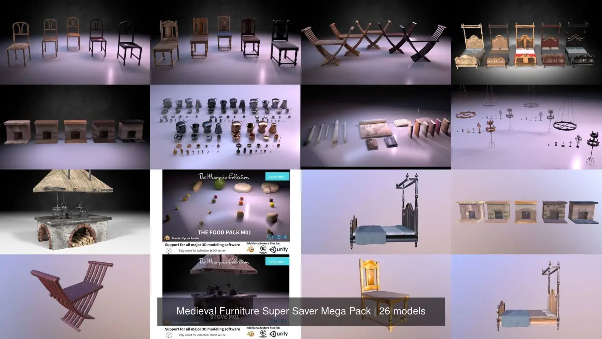 This collection puts all our best sellers in a single super saver pack that combines tens of assets into one single and unique collection. This is a must have pack for anyone working with medieval themes with interior settings. All our assets are low poly and game ready.