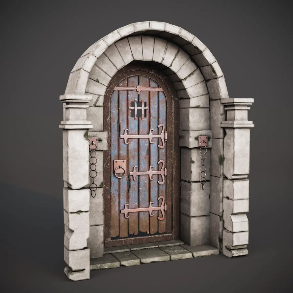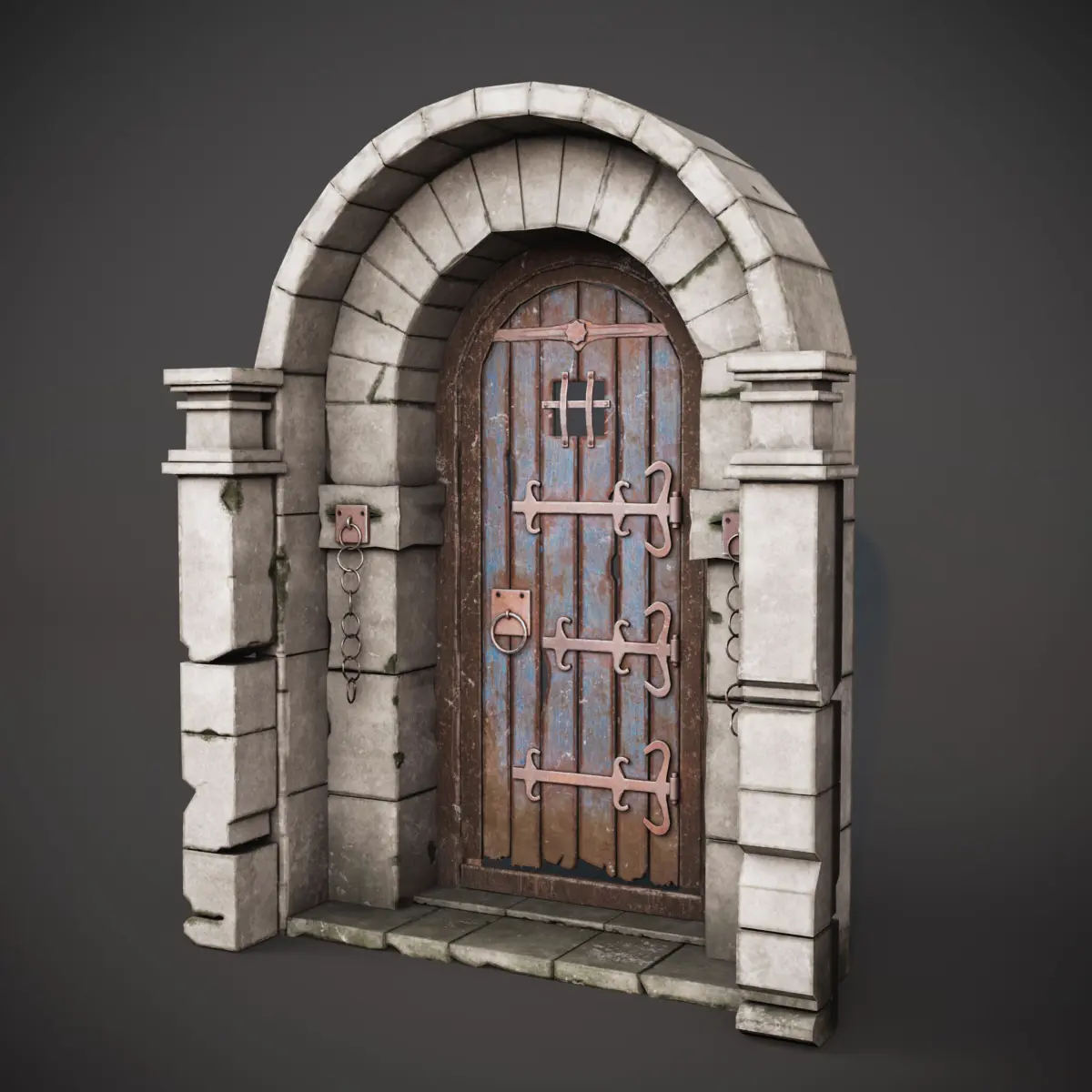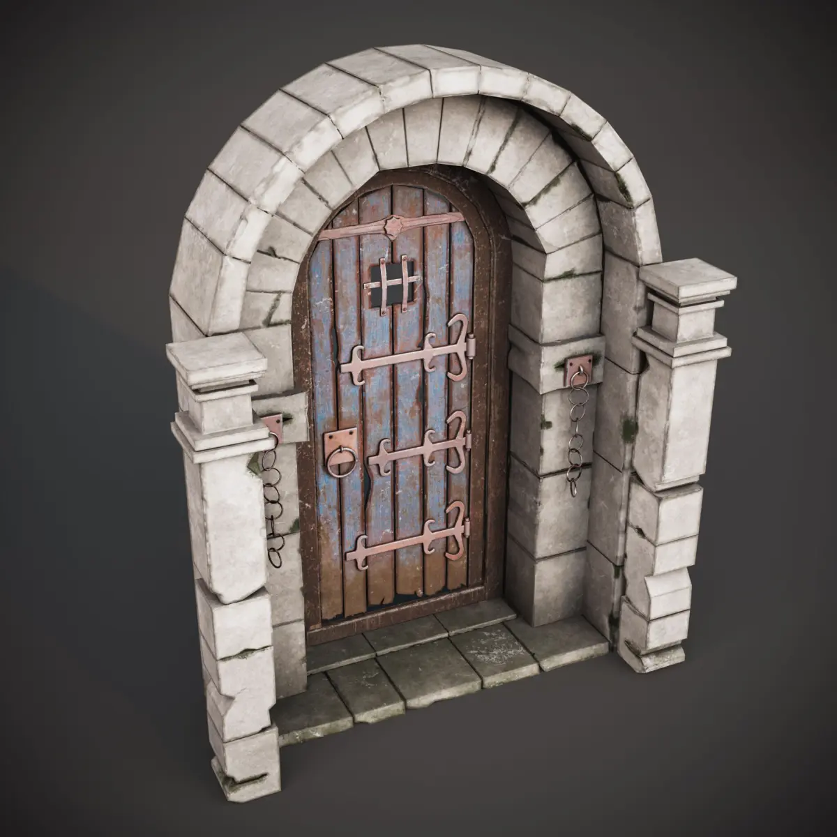 The gate is designed for medieval, fantasy, dungeon, or castle environments, with weathered wood, rusted metal details, and a realistic stone arch for your game levels or environment packs.