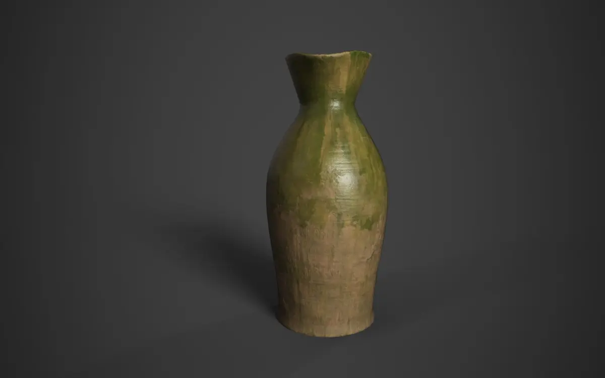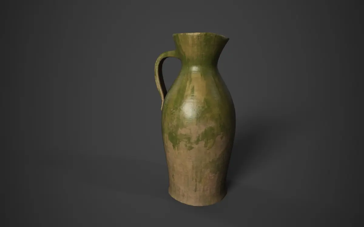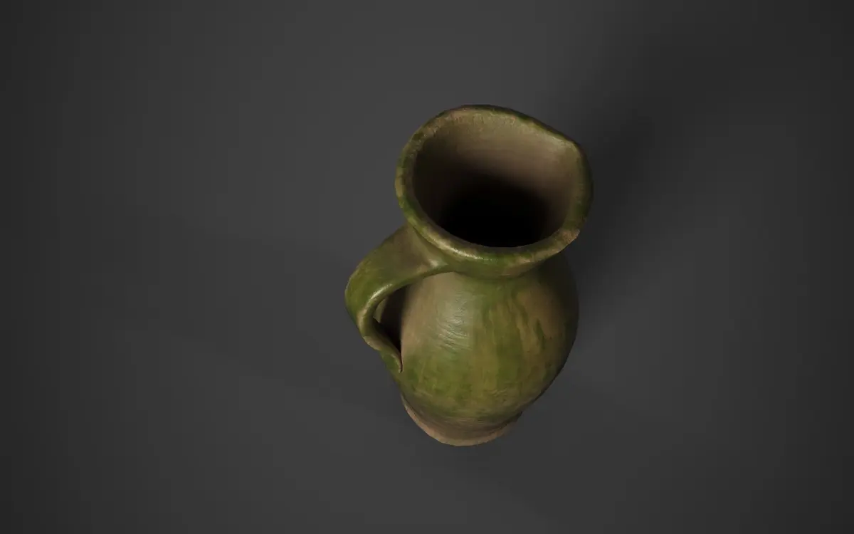 This is a 3D reconstruction of a Tudor Green ware jug, a type of glazed pottery that was typical in Southern England during the late Medieval period. The green glaze is spread unevenly over the base pot creating an interesting mix of colours and roughness values.