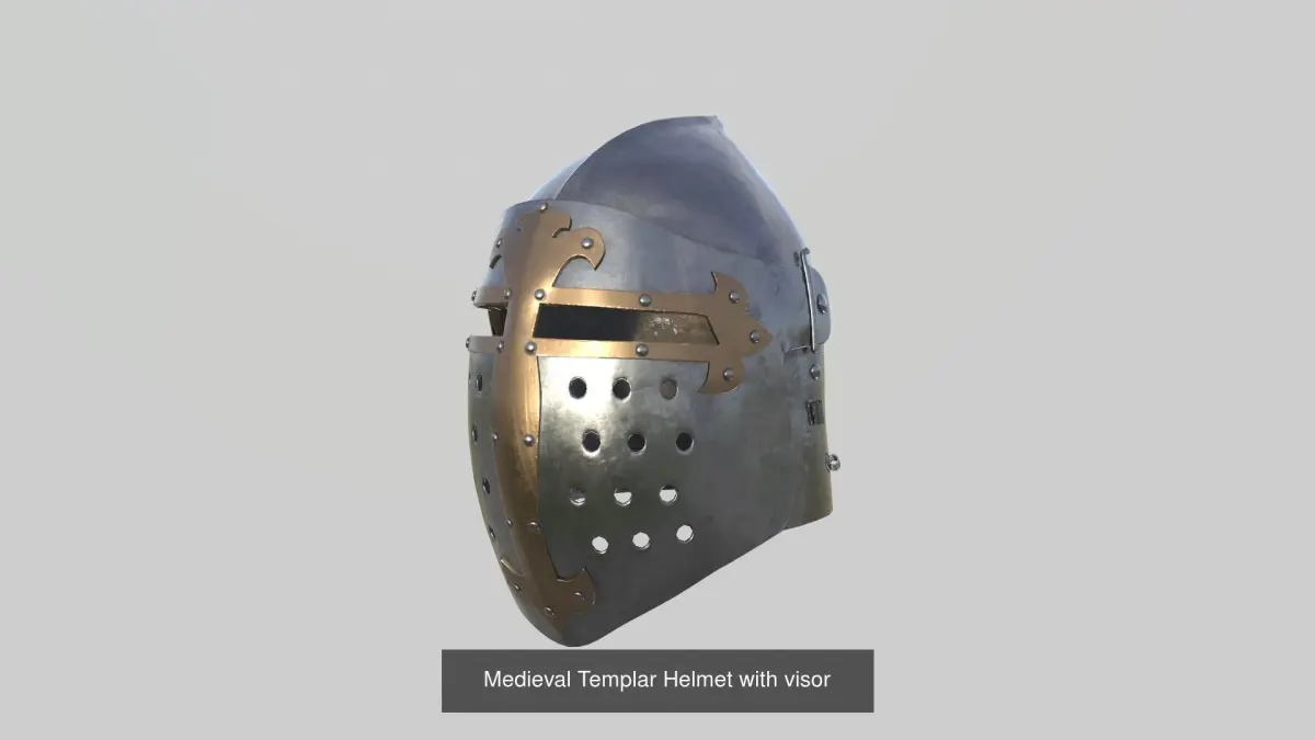 Pack of 16 differents types of medieval helmets like : Kettle, Sallet, Armet, Bascinet, Morion, Templar and more basic helmets.Game ready realtime models with pbr workflow.Most of the visors and parts are articulated.For each model you have different format (Obj, FBX, Native file, 3DS) and 4k PBR textures (Base color, Metallic, Roughness, AO, Normals and Height)