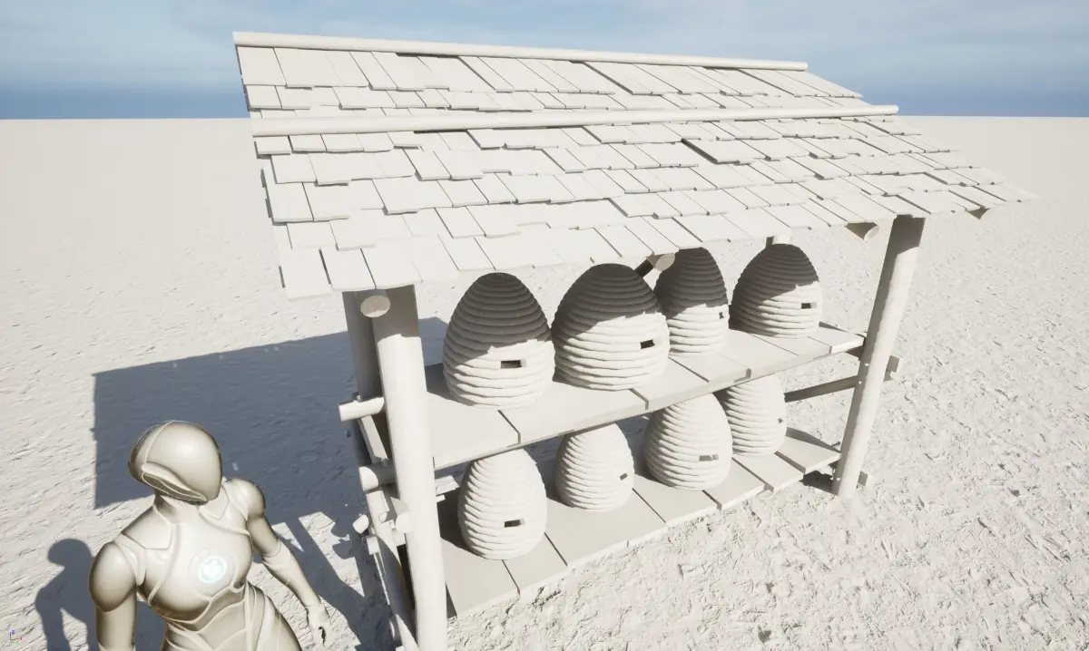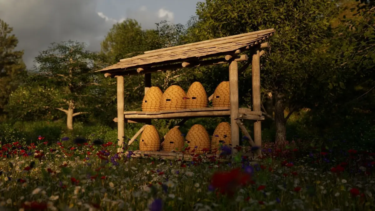 Low-poly historical reconstruction of a shelf for bee skeps for traditional bee keeping. A skep is a domed basket to house honey bees. European beekeepers switched from hollowed out logs to straw skeps around 800 AD. It’s made from all natural material like straw or hay bundles that are wrapped around a hollow dome. These bundles are stitched together with blackberry cane, which was split in half first. A slit of about 15 cm enables bees to enter and exit the structure. The rack has a shingle roof to protect the hives against the weather.