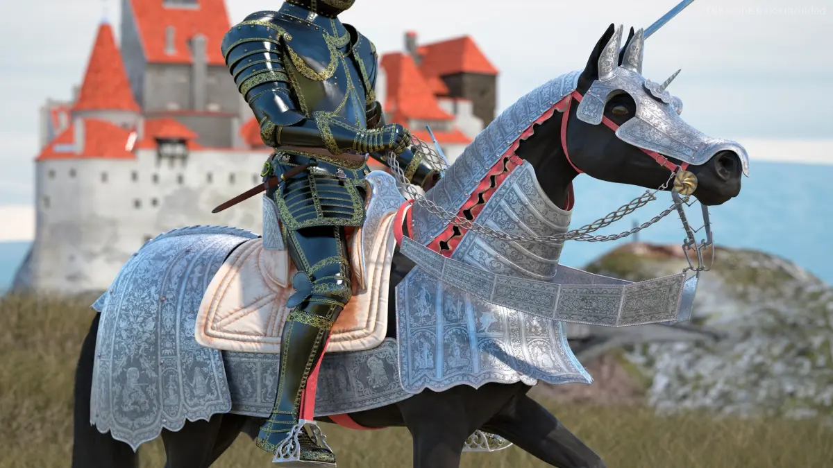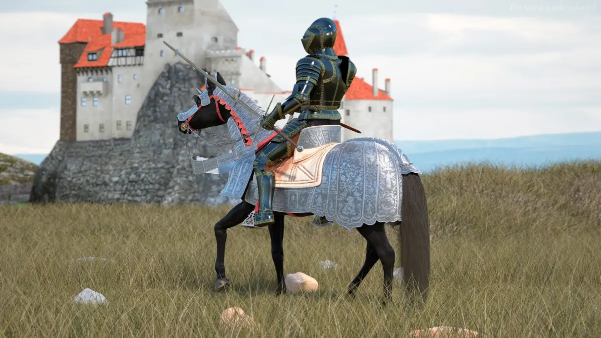 Medieval Horse in Armor with Knight Riding Fur is a three-dimensional model of knight holding a sword and riding a fully armored horse, that is designed to capture the detailed appearance of medieval warfare mounts and their riders.