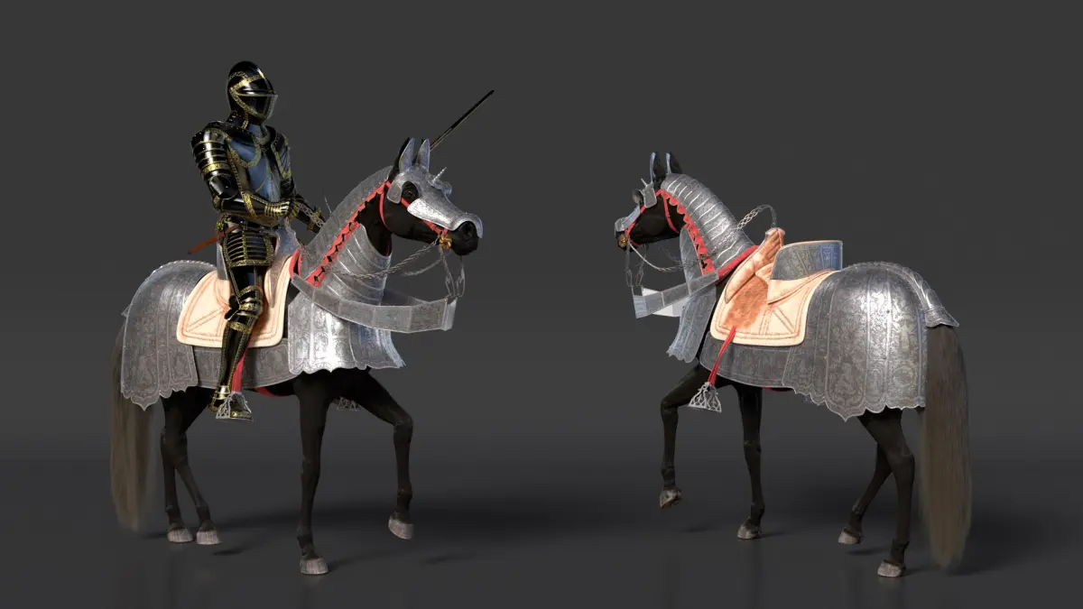 Medieval Horse in Armor with Knight Riding Fur is a high quality, photo real 3d model that will enhance detail and realism to any of your rendering projects. The model has a fully textured, detailed design that allows for close-up renders, and was originally modeled in 3ds Max 2020 and rendered with V-Ray. Renders have no postprocessing!