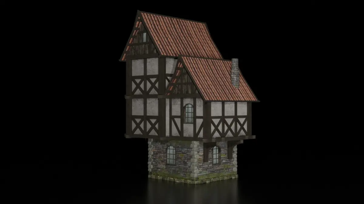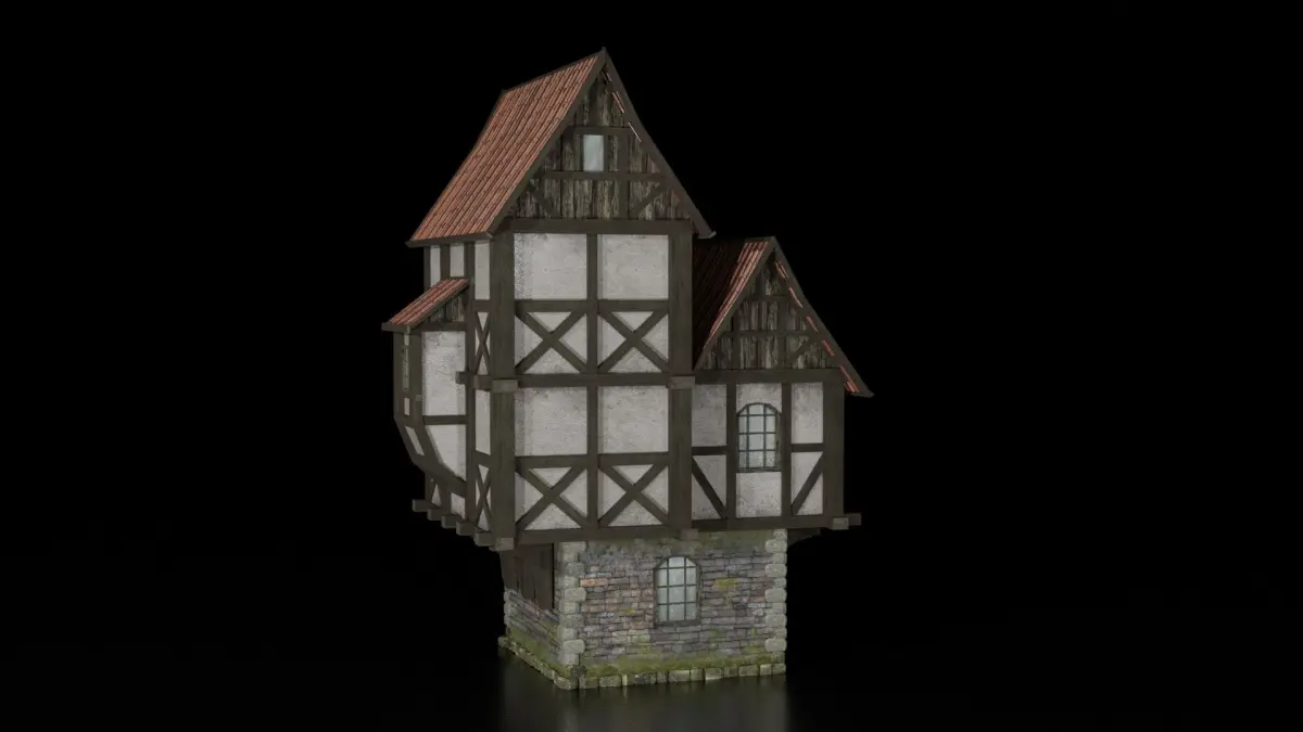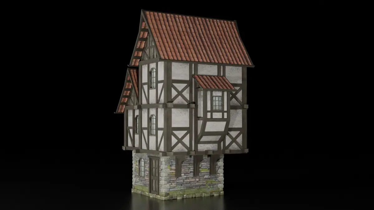 AAA quality ready-to-play model of a medieval residential building. It comes with a lowpoly module, perfect for optimizing and rendering games, and as a kidbash too. Inside, the building is not decorated, the building is made like the exterior of the city. The normals are not inverted, the vertices are not doubled. The grid and map are named correctly and placed in precisely sorted folders. No hidden mess inside the mesh. Seamless and tiled textures are applied. No visible texture repetitions. The model is basic (blank frame) with no additional objects, so you cannot position the objects yourself, depending on your concept. Every detail is neat and polished. The building fits into the concept of the Middle Ages and fantasy, suitable for RPGs, 3D jokes, strategy games and other games. FBX + OBJ + blender save formats included.