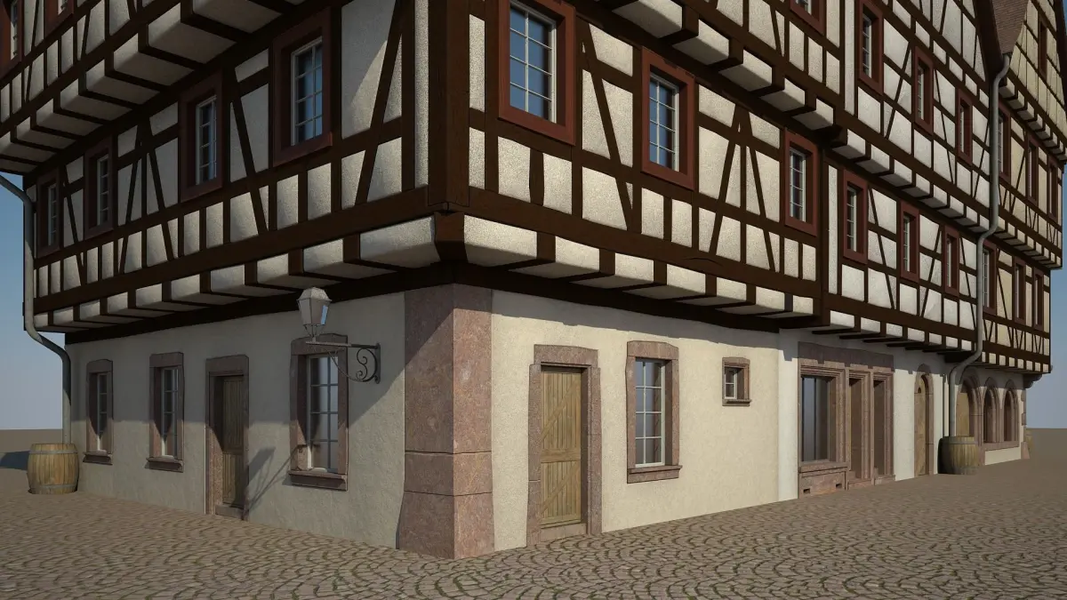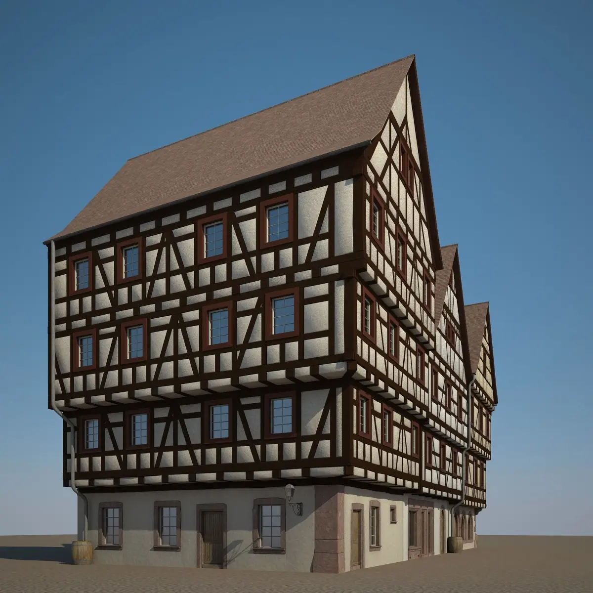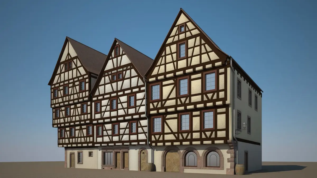 Detailed 3D model of a row of three medieval houses.Suitable for high resolution close-up. Real world scale.