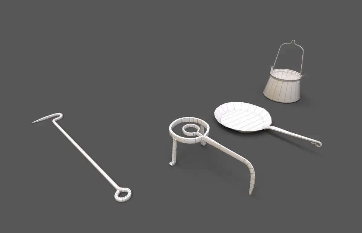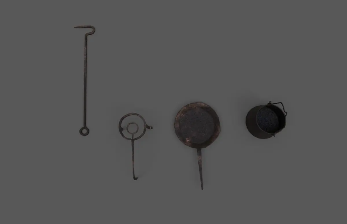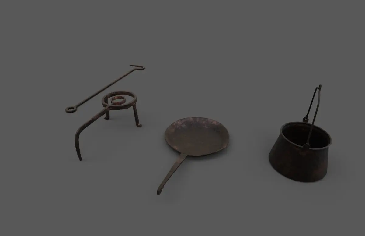 Low-poly historical kitchen equipment made from iron, how it was used since the middle ages. This set consist of four basic parts, which where found in almost every household back then.