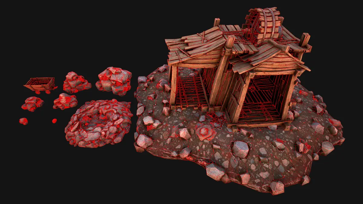 Game ready models.Stylized and detailed Medieval Iron Ore Mine Pack fully textured, sculpted and rendered with Physical based rendering (PBR) - Shown images have been rendered in Marmoset Toolbag .The models contains lods, detailed information on the images.The set contains a Mine Model and a Miner's Cart, as well as 6 Iron Ore models and 2 Landscape models.