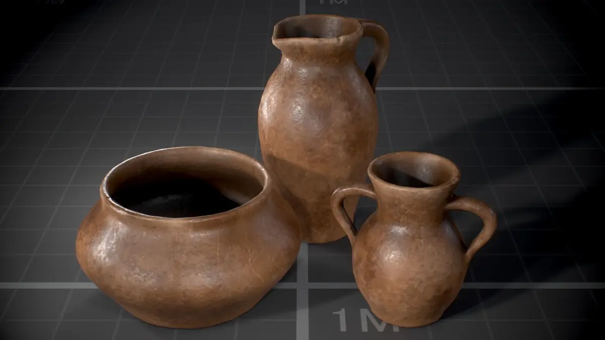 - 3 used medieval jugs , poly-count - 1224, 1242, and 1292 triangles .