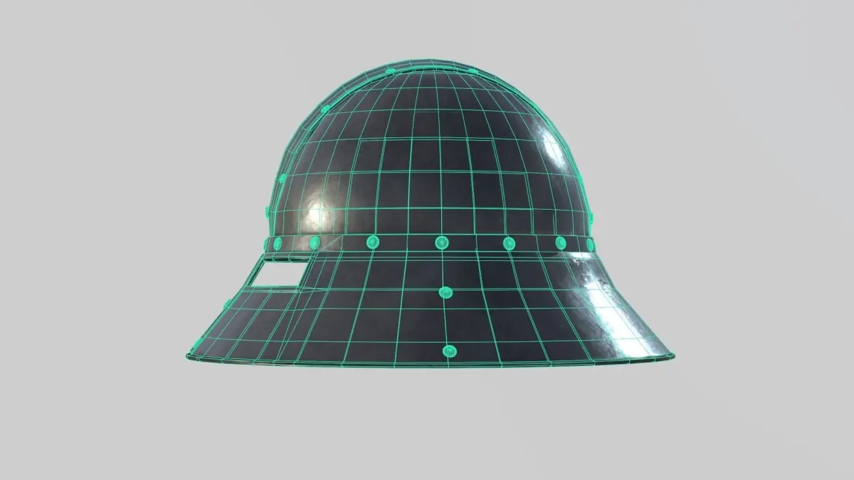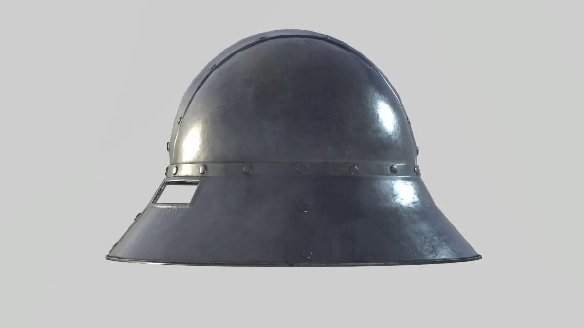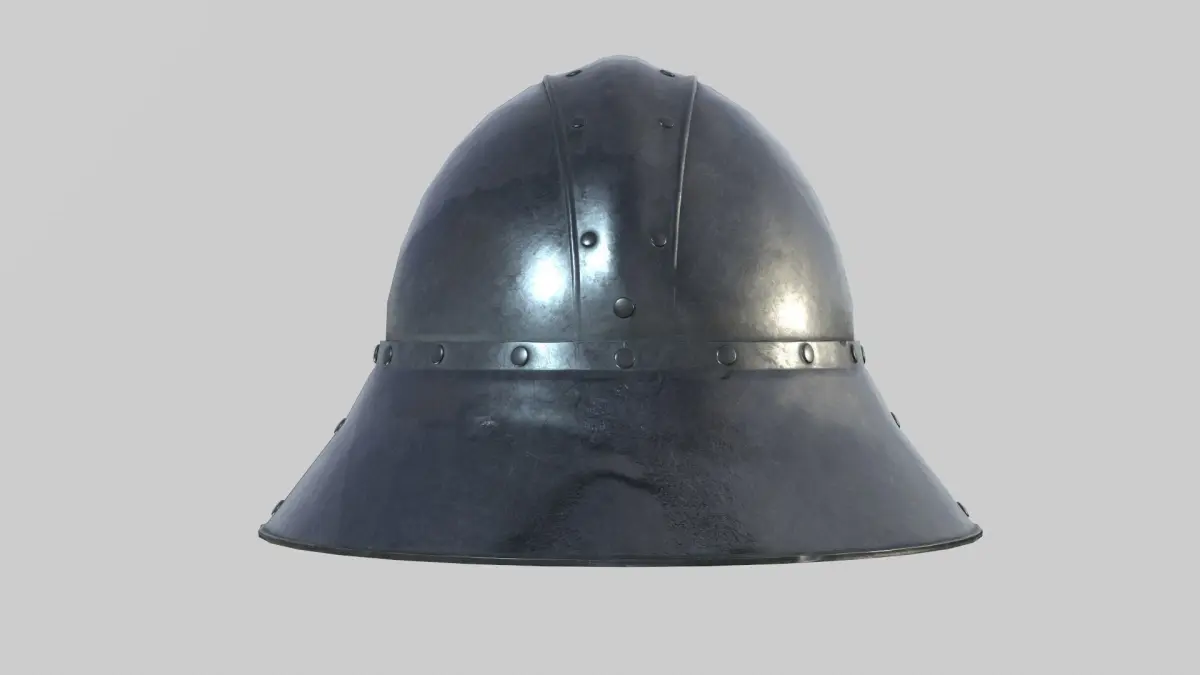 A kettle hat, also known as a war hat, is a type of helmet made of iron or steel in the shape of a brimmed hat. Usually worn by common soldiers, there are many design variations. This one procure face protection with slits fot the sight. The only common element is a wide brim that afforded extra protection to the wearer. It gained its common English language name from its resemblance to a metal cooking pot.