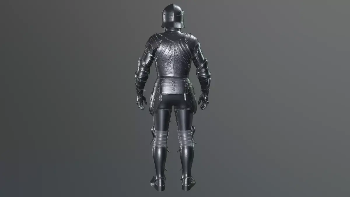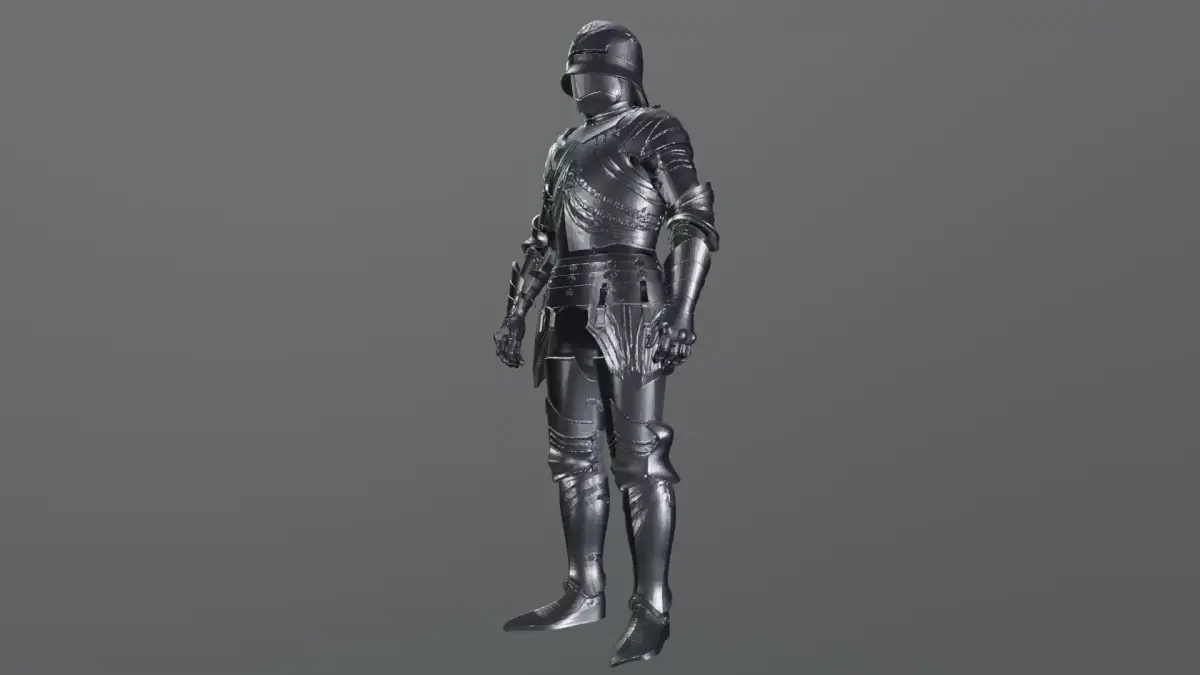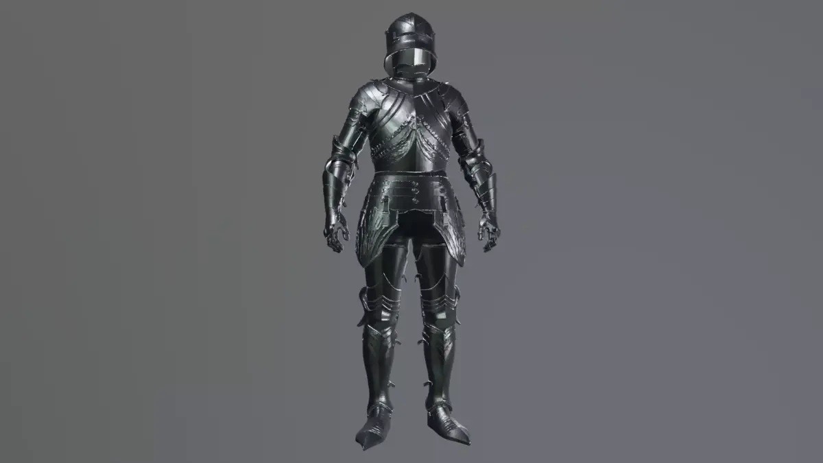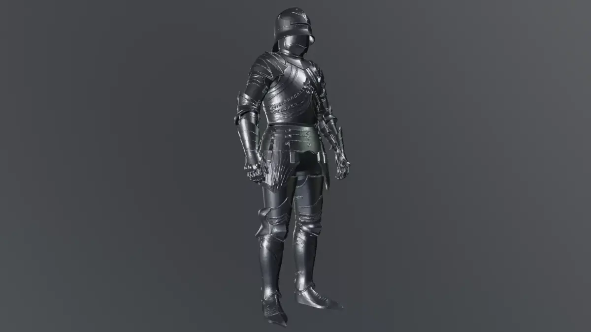 A full suit of dark medieval plate armor with a closed helmet and polished steel finish. The design features layered metal plates covering the torso, arms, and legs, with articulated joints that suggest mobility and protection. The chest armor is shaped with subtle engraved lines and reinforced segments, while the waist is guarded by a segmented plate skirt secured with metal fasteners.