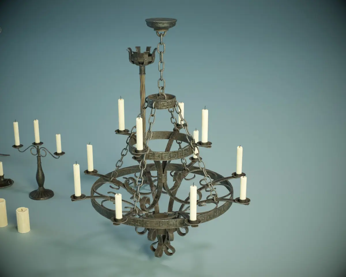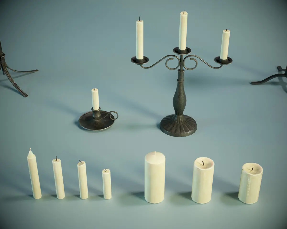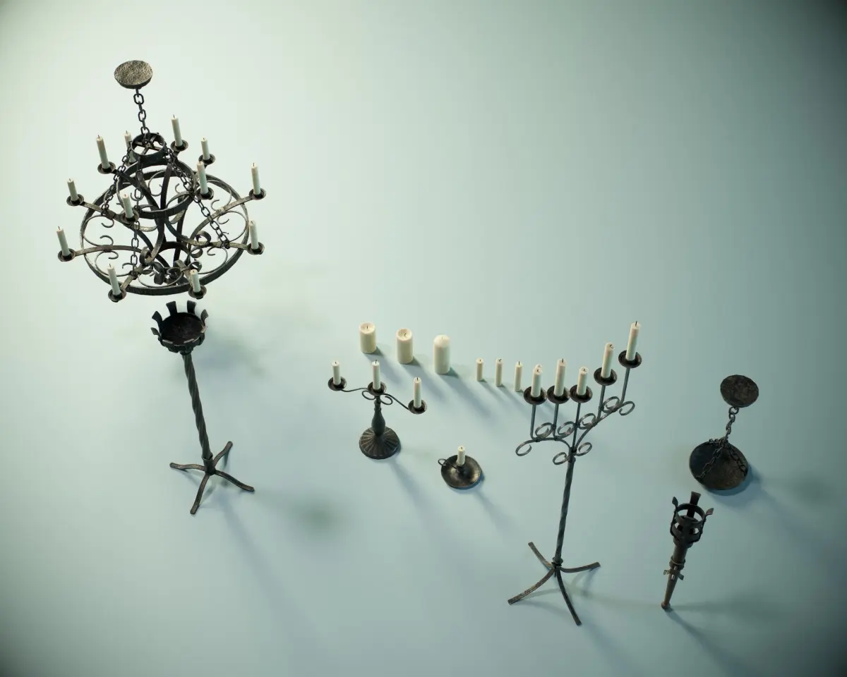 -Model was not intended for subdivision-Real World Scale Measurements-No special plug-ins necessary to use this product -Quad/Tris only polygon - 24783 count -Texel density is 35.36 for 2kcandles set UV-maps, 23.17 for 4klamps and torches set UV-maps