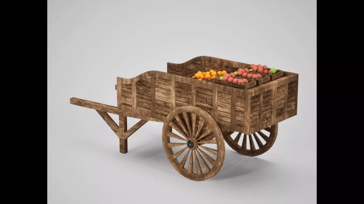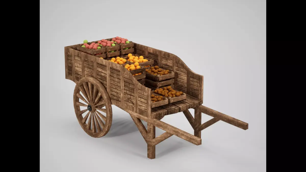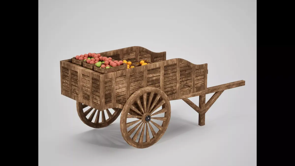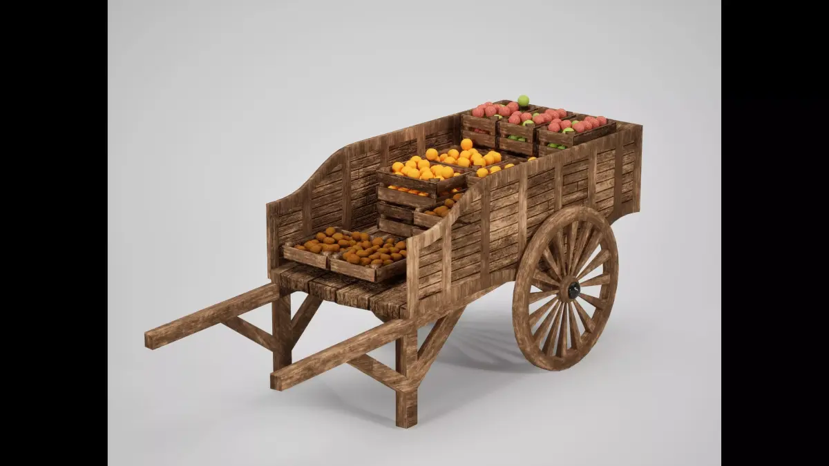 This asset brings life to any village or trade route, featuring a heavy load of open wooden crates filled with various fruits and vegetables (apples, oranges, and potatoes). It is designed to act as a hero prop in a marketplace or a background element in a farming simulation.