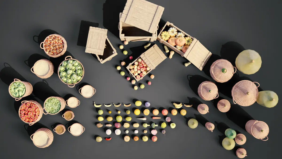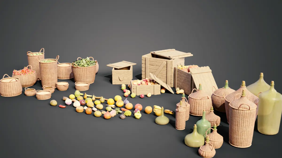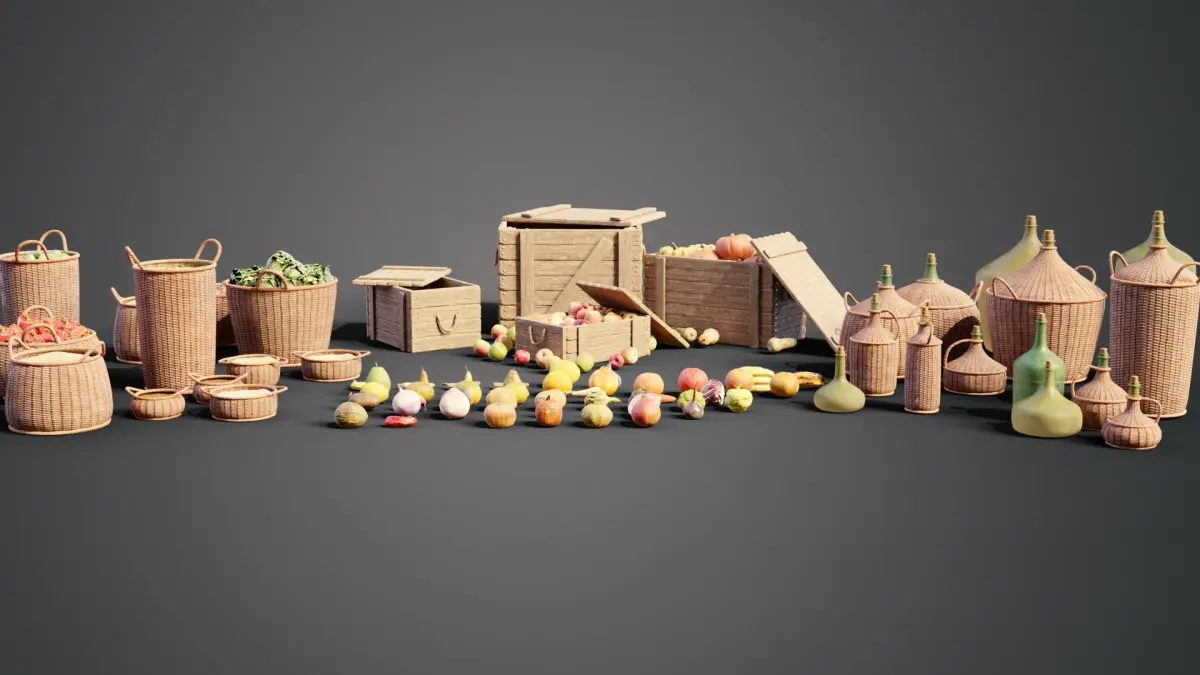This pack contains: 4 wooden boxes, 9 glass bottles (with 4 different base color textures for more color variations), 9 wickered baskets for bottles, 7 wickered baskets (with 6 different textures used for basket contents), 67 different fruit and vegetable models. PLEASE NOTE: Fruit and vegetable models included in this pack are not calculated in the price, as they can be obtained for free with CC Attribution license. This collection was made by a user that goes by Loic Norgeot username on a different marketplace (I can't post a link to it or advertise the site here, but you can try and google it). If you are considering on buying this pack solely for the fruit and veggie collection, do this only if you wish to have all the materials already set up in Blender. Otherwise, just get it for free on *ketch*ab.
